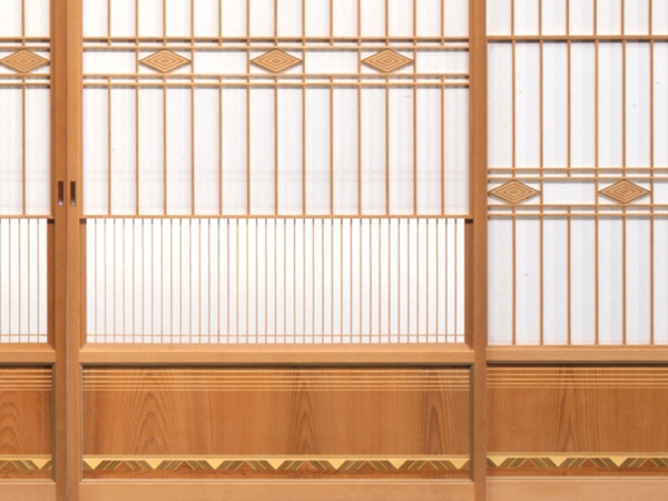 雪見通風障子 全国建具展福島大会入賞 縦格子の中に象嵌で作った菱模様を入れ込みました。 中心の2枚は通風障子。 腰細工は、杉板に朴やヒバで細工をしたものです。 (このデザインで硝子戸・紙張障子にもできます) 寸法: W3700xD30xH1800 材質: (建具)吉野杉 (腰)杉板・朴・ヒバ « 一覧へ戻る