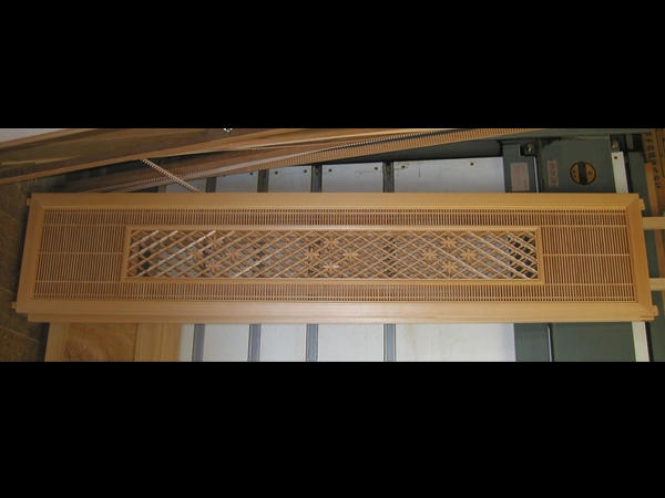 欄間(松皮とんぼ) 縦の組子と横の組子で「トンボ」という形を作り、松の葉にとんぼがとまっている様子を表しています。 社寺仏閣によく使われる柄で、加工がとても難しい技法です。 寸法: W1800xD32xH450 材質: 桧 « 一覧へ戻る