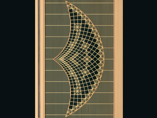 孔雀 シンプルな格子の中に大きな曲線を描く「扇面組子」は、末広がりのデザインで、縁起物として良く好まれます。 扇を組むための「クデ加工」はとても難しい技です。 寸法: W1200xD30XH2400 材質: (枠)吉野杉 (組子)ヒバ・杉 « 一覧へ戻る