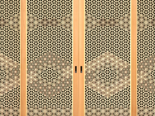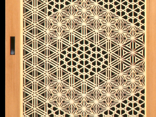 唐織 組子で帯の部分の編柄を組み入れた作品。 腰の部分には、屋久杉を六角形に細工して作った物を使用しています。 寸法: W1800xD30xH1800 材質: (枠)吉野杉 (組子)ヒバ・杉・朴 (腰)屋久杉 « 一覧へ戻る
