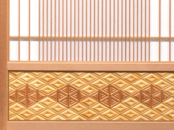 紙張障子 縦骨を加工しながら扇形を作り、落着きがあり、趣きのある雰囲気です。 腰細工は特殊加工を施したものです。 (このデザインで硝子戸にもできます) 寸法: W1800xD30xH1800 材質: (建具)吉野杉 (腰)桧・杉 « 一覧へ戻る