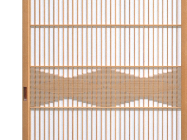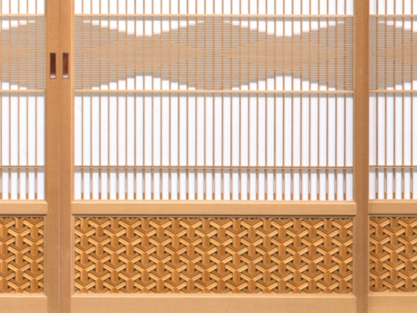 紙張障子 全国建具展埼玉大会入賞 縦格子に細い骨で長さを変えながら菱模様を浮き出させたように組描いた帯柄です。 腰細工は特殊加工を施したものです。 (このデザインで硝子戸にもできます) 寸法: W3700xD30xH1800 材質: (建具)吉野杉 (腰)杉 « 一覧へ戻る